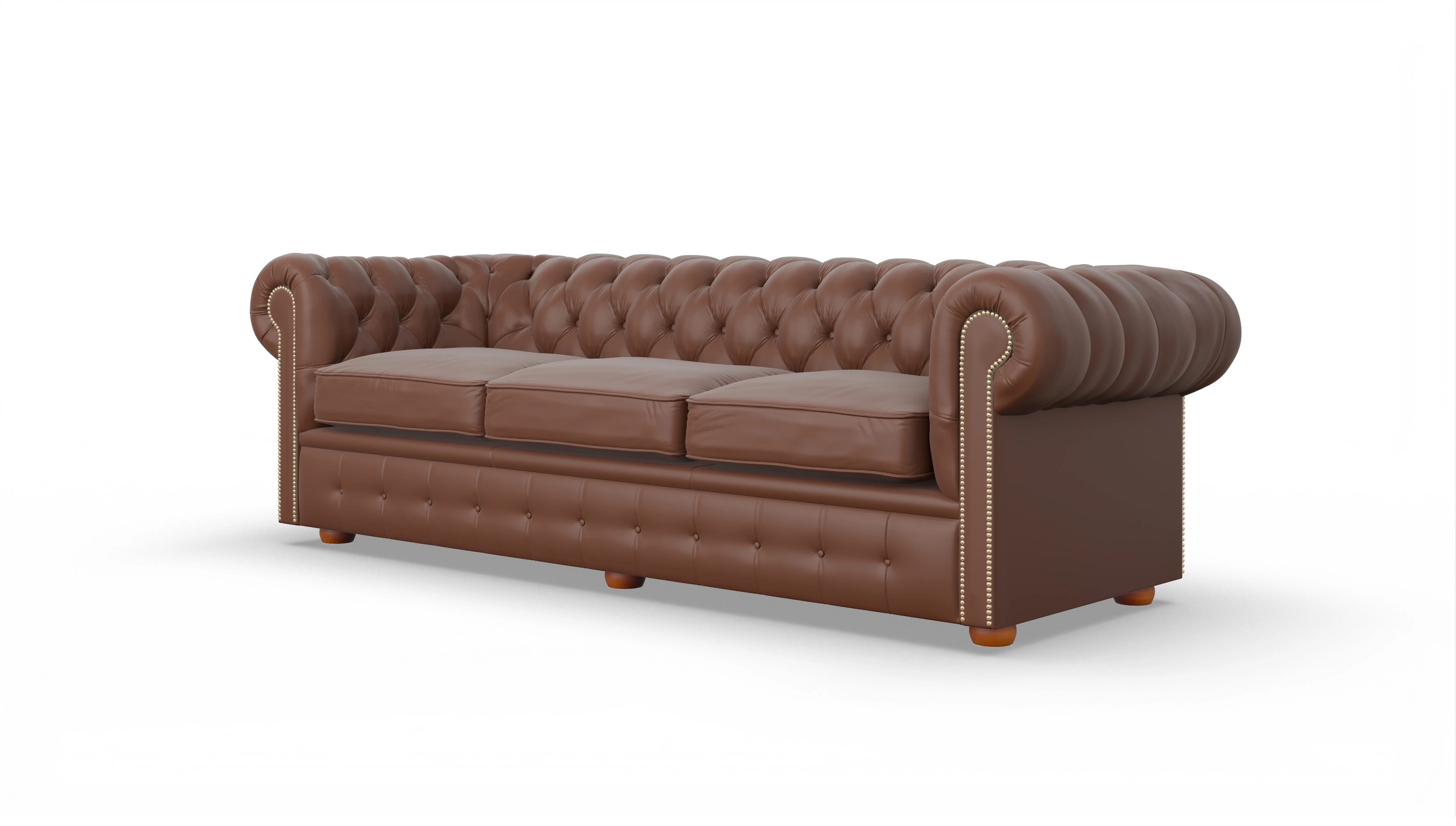 Die geraden Arme und die Rückenlehne sind vollständig gepolstert. Auf diese Weise sind maximaler Komfort und jahrzehntelange Formbeständigkeit garantiert. Liebevolle Details, wie die von Hand genagelten Nägel und die auf Hochglanz polierten Holzfüße machen dieses stilvolle Chesterfield Sofa zu einem unserer Lieblingsstücke. Als ideale Ergänzung empfehlen wir Ihnen den Clubsessel "Brighton".