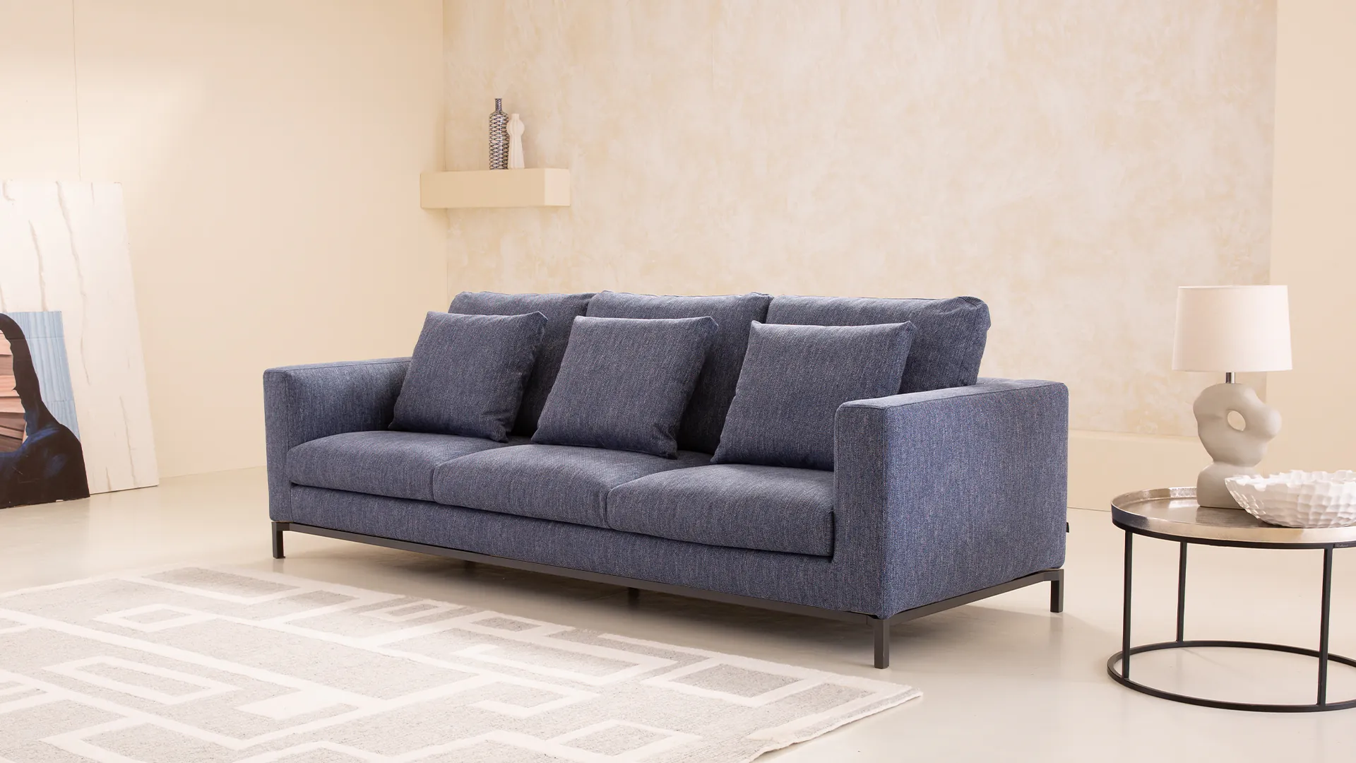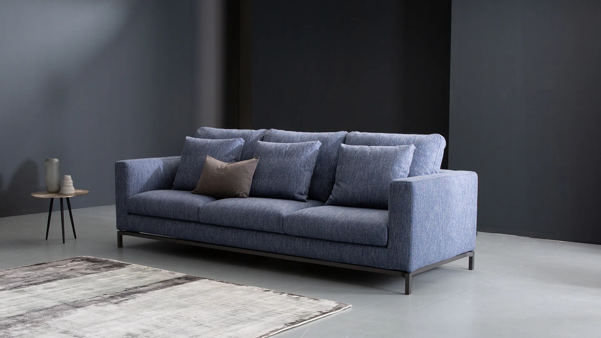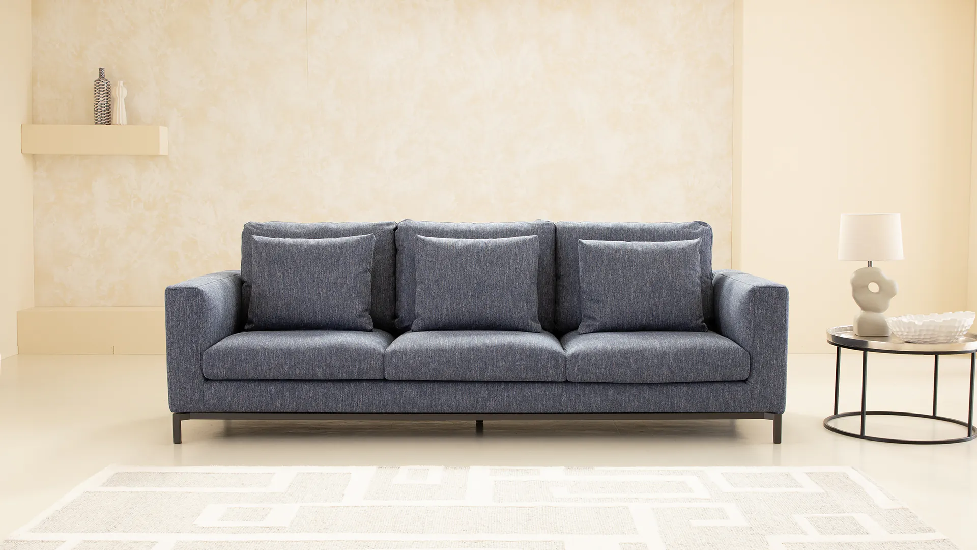 Die Design-Couch Fenice besticht durch ein klares, aber nicht zu strenges Design. Durch die losen Rückenkissen wird die geradlinige Form unterbrochen. Zusätzlich wird der "luftige" Eindruck durch den anthrazitfarbenen Stahlsockel unterstützt.