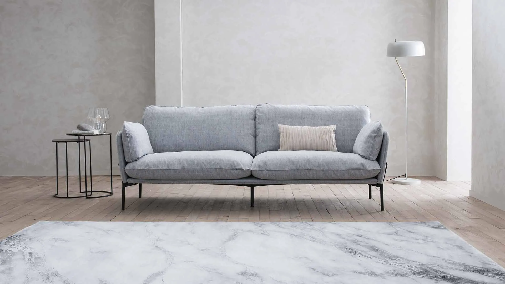 Der Lederhocker Crimora mit seinen hohen, schwarzen Metallfüßen und einladendem Kissen wirkt leicht, fast schwerelos.
