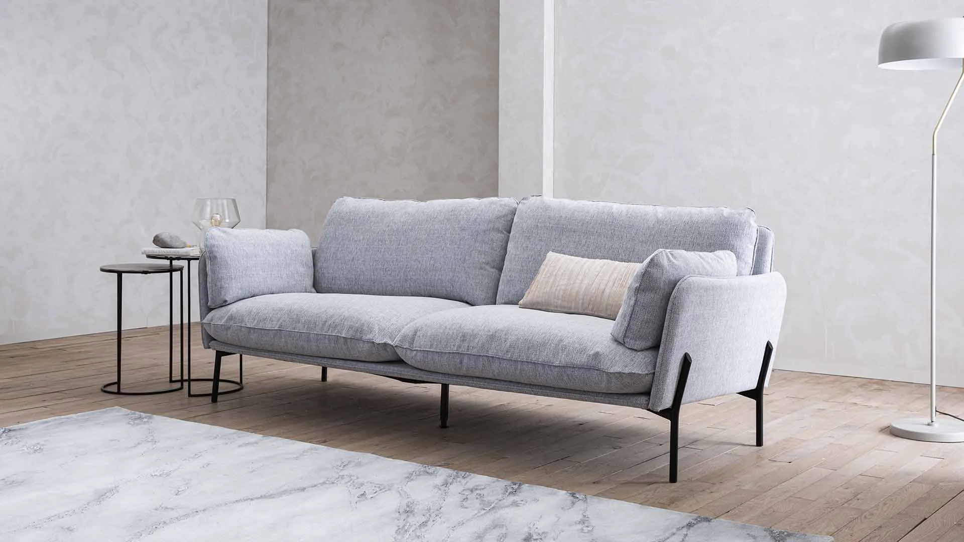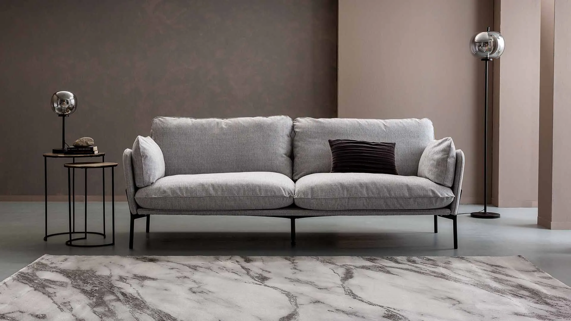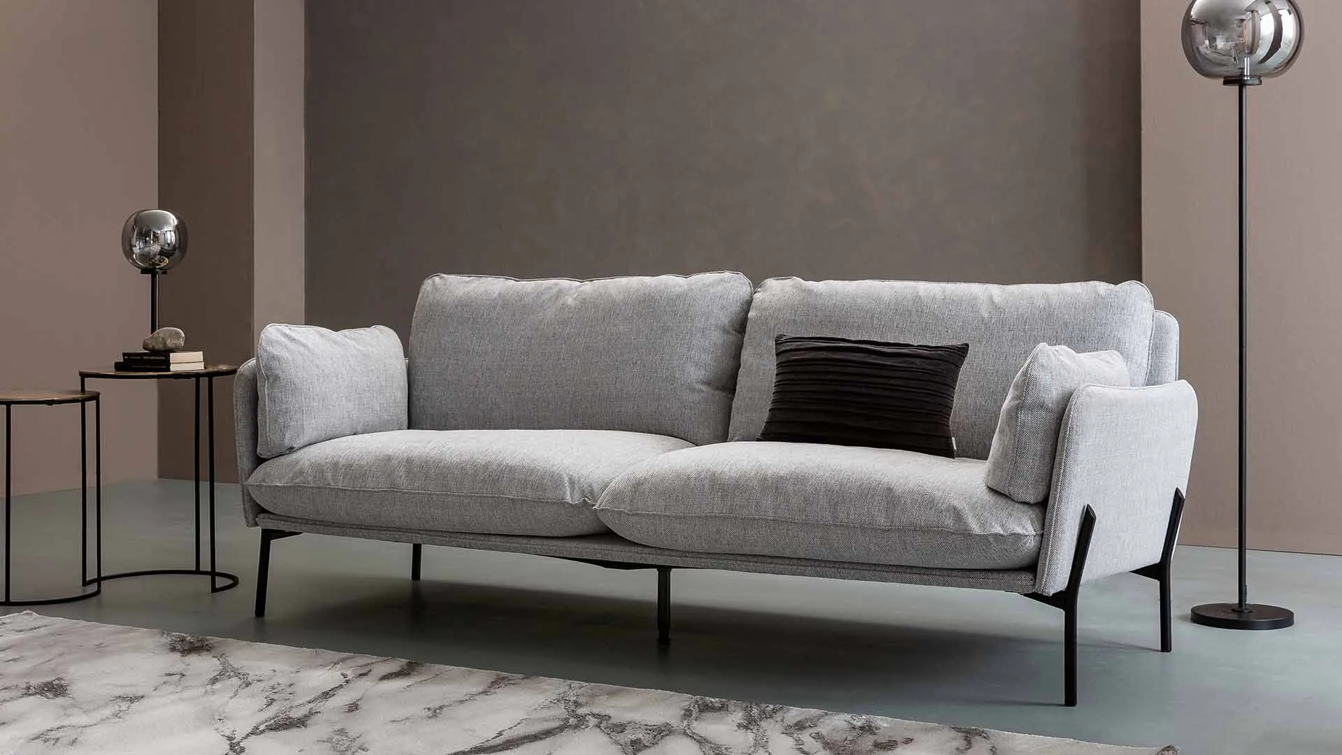 Das Design-Sofa Crimora ist in einer wunderschönen Auswahl an Ledern verfügbar. Gerade die hellgrauen und dunkelbraunen Leder passen sind wunderbar passend für einen modernen Wohnkontext.