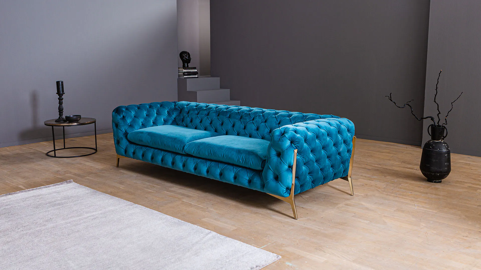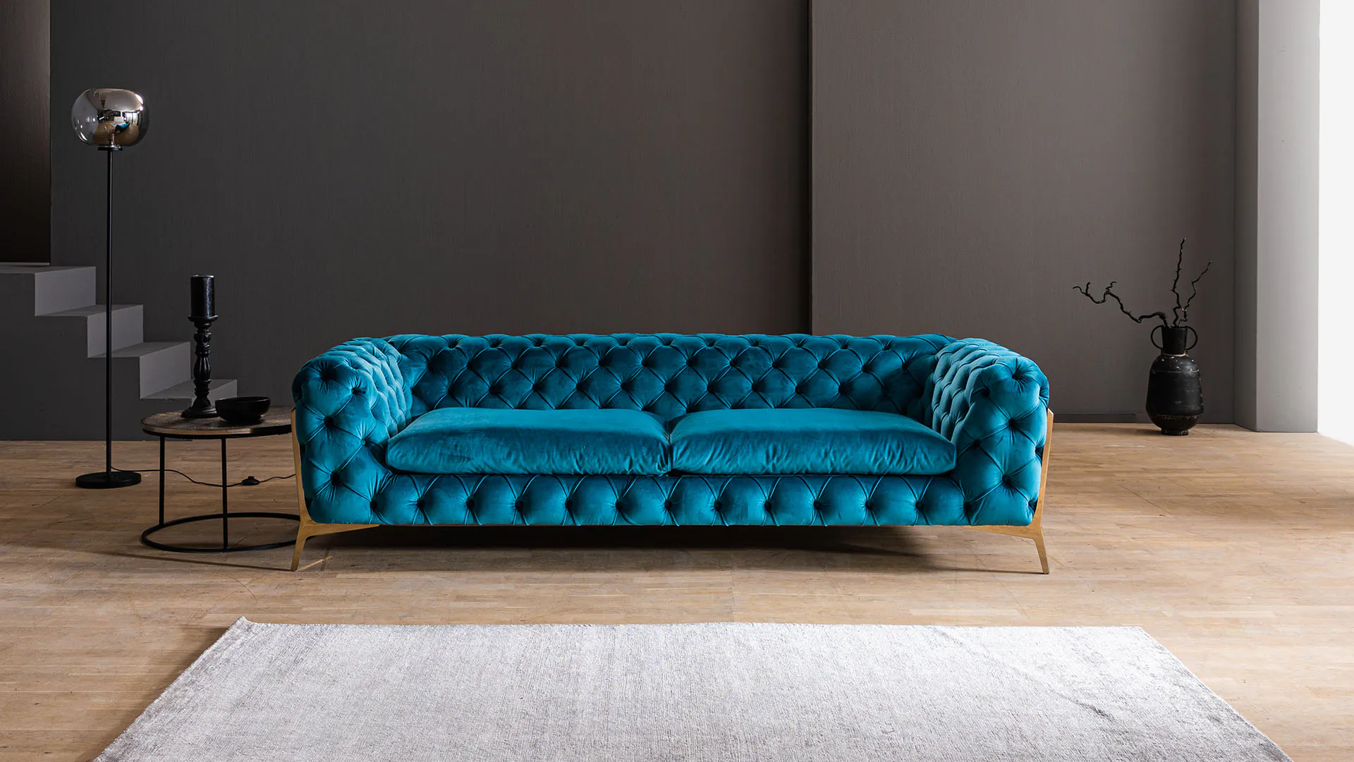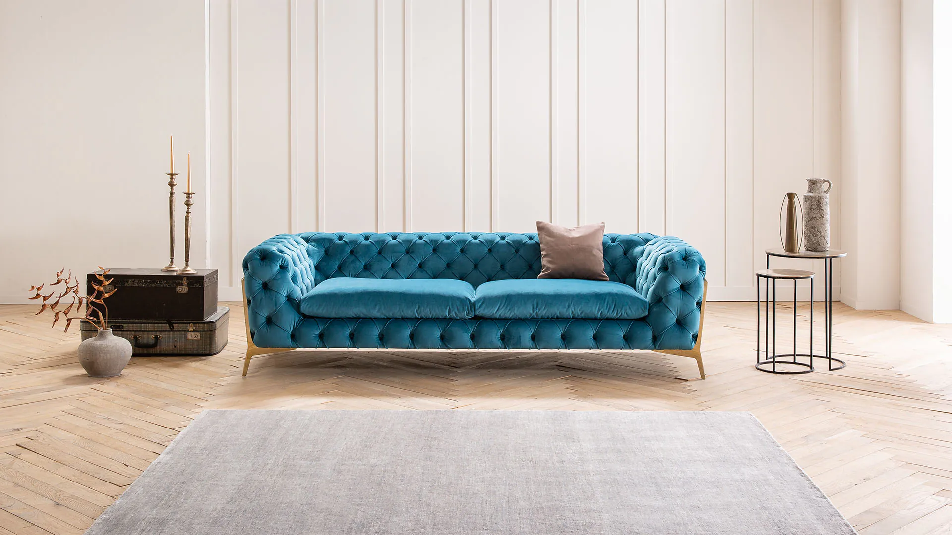 Zukünftigen leidenschaftlichen Unterhaltungen und zwanglosen Stunden auf Ihrem Sofa steht nichts mehr im Weg. Das Chesterfield Samtsofa Juno lädt ein zum Platznehmen und Zurücklehnen. Durch eine Auswahl an erlesenen Samtstoffen lässt sich das Sofa leicht Ihrem persönlichen Wohnstil anpassen.