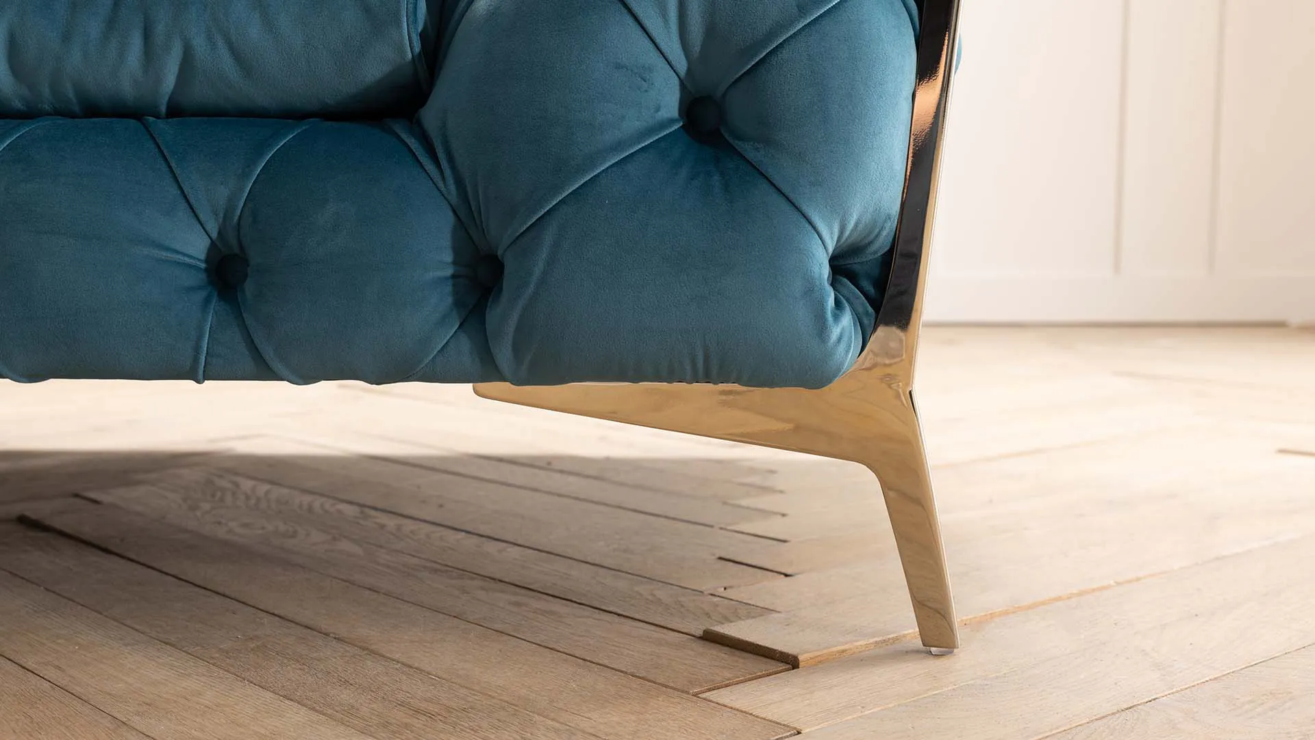 Eine Neuinterpretation traditioneller Handwerkskunst: Das Samtsofa Juno im modernen Chesterfield Stil überzeugt mit anspruchsvoller Formensprache und meisterhafter Fertigung. Der Korpus des Sofas ist in handgefertigter Knöpfung traditioneller Chesterfield Modelle gekleidet. Elegante Sitzkissen mit niedrigem Profil und champagnerfarbene Metallfüße verleihen dem Modell seinen makellosen Look.
